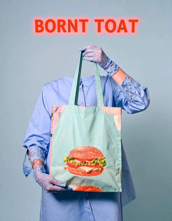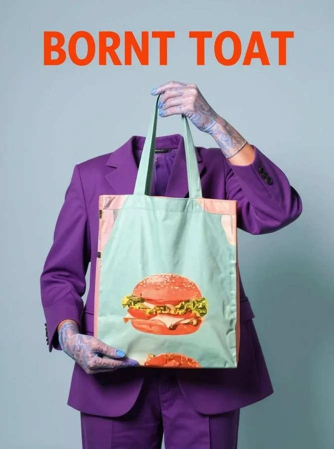 The brief was: bold brand identity for a tote company. The AI delivered a headless person in a purple suit with tattoo gloves holding a burger tote. The brand name is orange. It says BORNT TOAT. This was not caught. It was saved anyway.
