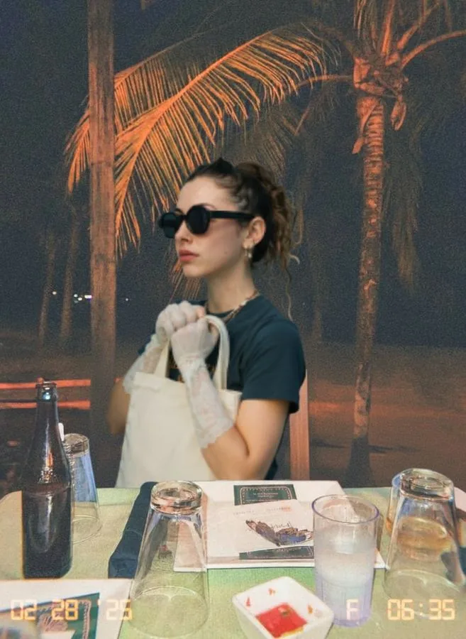 A candid lifestyle campaign: a woman at a tropical restaurant at night holding a tote bag with lace gloves. The gloves have appeared again. The timestamp reads 02/28/25. This is the most photorealistic image in the collection. The gloves are still unexplained.