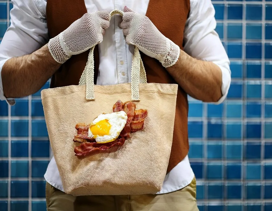 Exploration of organic textures and natural materials. The model interpreted "organic" literally. A full cooked breakfast is adhered to the tote. The egg is sunny side up. The gloves are mesh. The tote appears structurally sound.