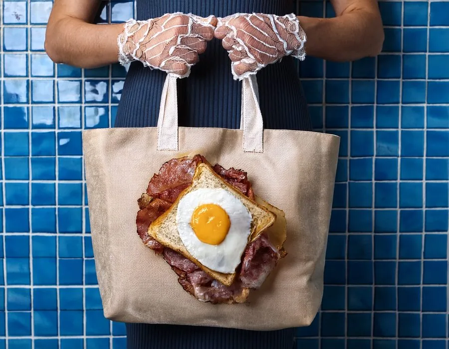 A continuation of the breakfast tote series. This iteration features toast. The egg has migrated to the toast. The bacon surrounds everything. The lace gloves have returned with ruffles. The blue tile wall was not in the brief.