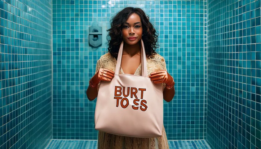 Brand identity mockup for Burnt Totes. Two letters are missing. Two are merged. One is leaving. The setting is a bathroom. The bathroom was not specified. The model chose the bathroom. The leather gloves were also not requested.