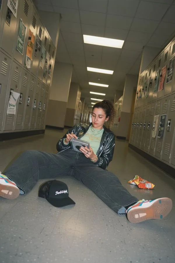 Youth lifestyle campaign concept. A girl sits on a school hallway floor looking at a photo frame. There is a hat on the floor. There are chips. She is not holding a tote bag. The hallway was AI's choice. The chips were not briefed.