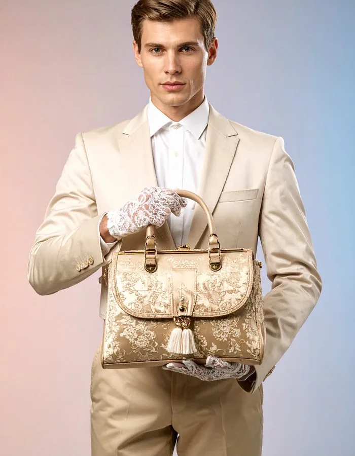 A luxury editorial concept for a men's brand. A man in a cream suit holds a gold brocade handbag with a tassel. He is wearing white lace gloves. This is a tote bag brand. The brocade bag was not a tote. The lace gloves have appeared again.