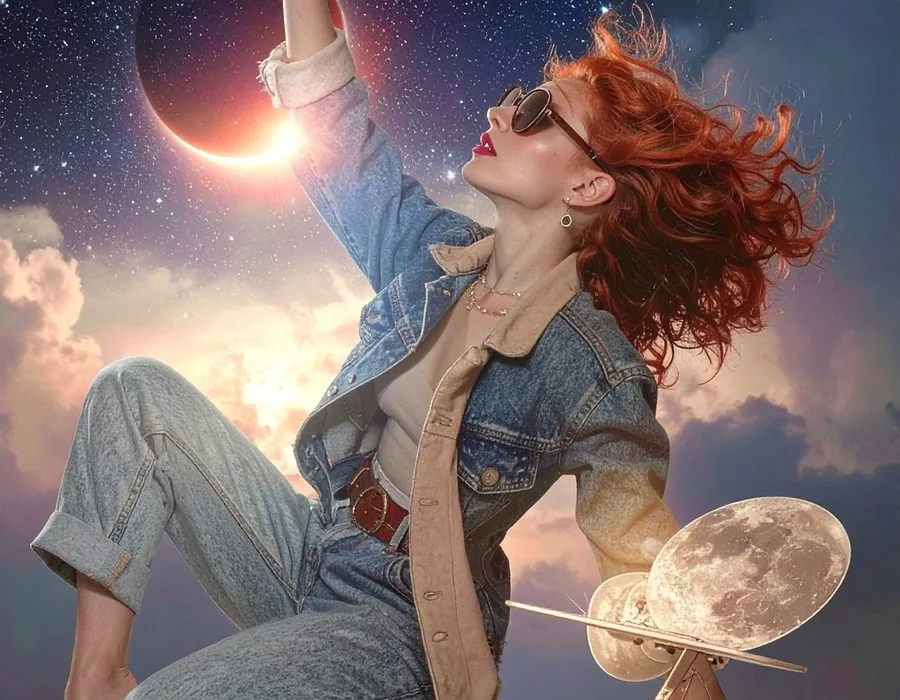 A brand campaign for an undetermined project. A redheaded woman in denim reaches toward a crescent moon while sitting on a satellite dish. The starfield is dramatic. There is no tote bag. There is no brief that explains this.