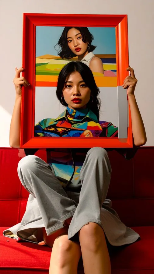 Conceptual campaign exploring identity and self-perception. A woman holds a framed painting of herself on a red couch. The painting shows her. She is also there. Neither is holding a tote bag. This was a tote bag brief.