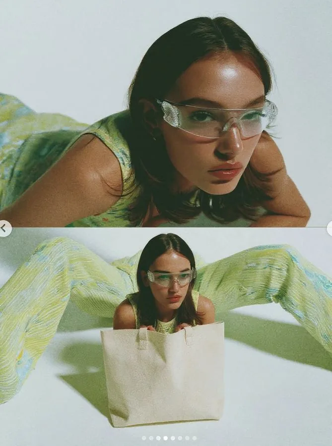 An editorial lifestyle shoot for Burnt Totes. The model has six limbs. She is wearing safety goggles in both frames. In the second shot she emerges from the tote as if hatched from it. This was described as a lifestyle shoot.