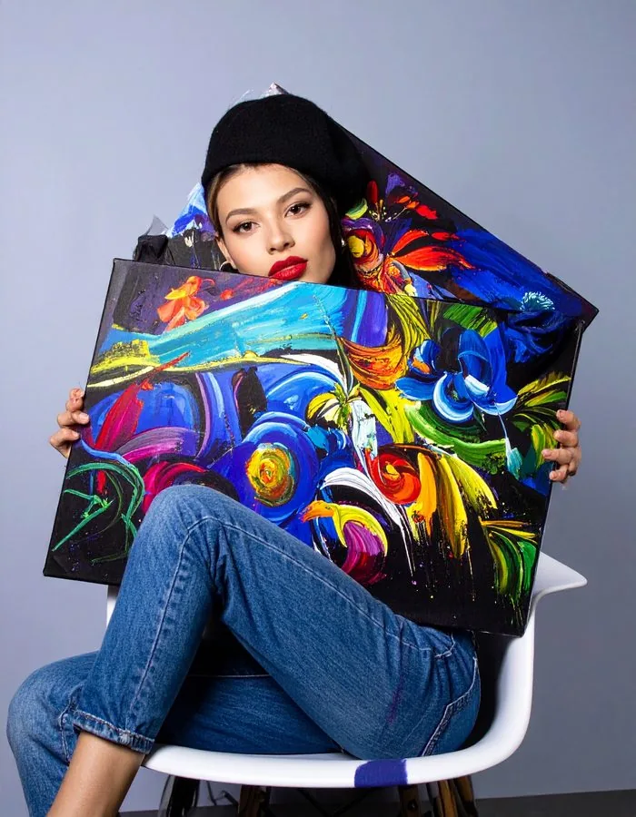 A woman in a beret holds an enormous abstract expressionist canvas covering most of her body. The beret is correct. There is a small piece of plastic wrap on her head for unknown reasons. No tote bag is present.