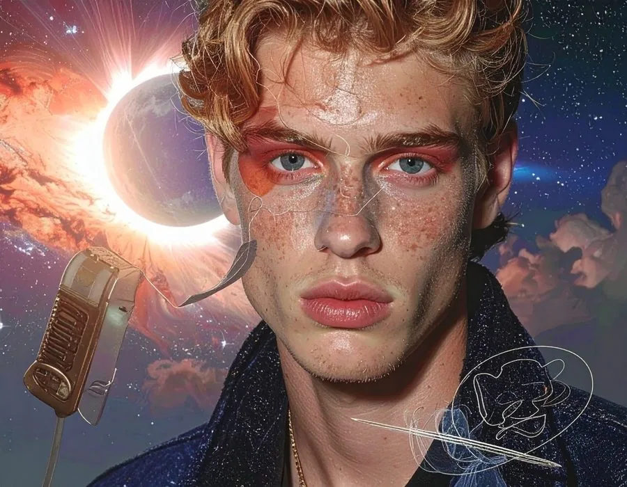 Created at 2am. Solar eclipse, vintage microphone, red eyeshadow, needle wire scribbles, and what may be a signature or a hex. No brief existed. No tote bag appears. The designer does not remember writing this prompt. She believes it is her best work.